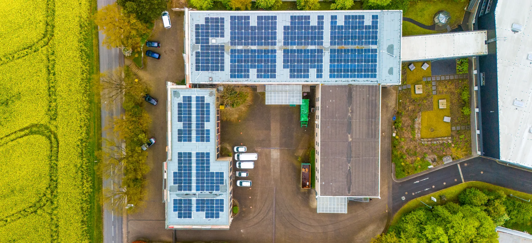 Technically, both systems are designed to be optimally tailored to local conditions and, in particular, our large flat roofs. They use state-of-the-art solar module technology with high efficiency and reliably supply our administration buildings, production halls and adjacent operational buildings with clean energy. The intelligent energy management system ensures that self-consumption and feed-in are efficiently regulated.