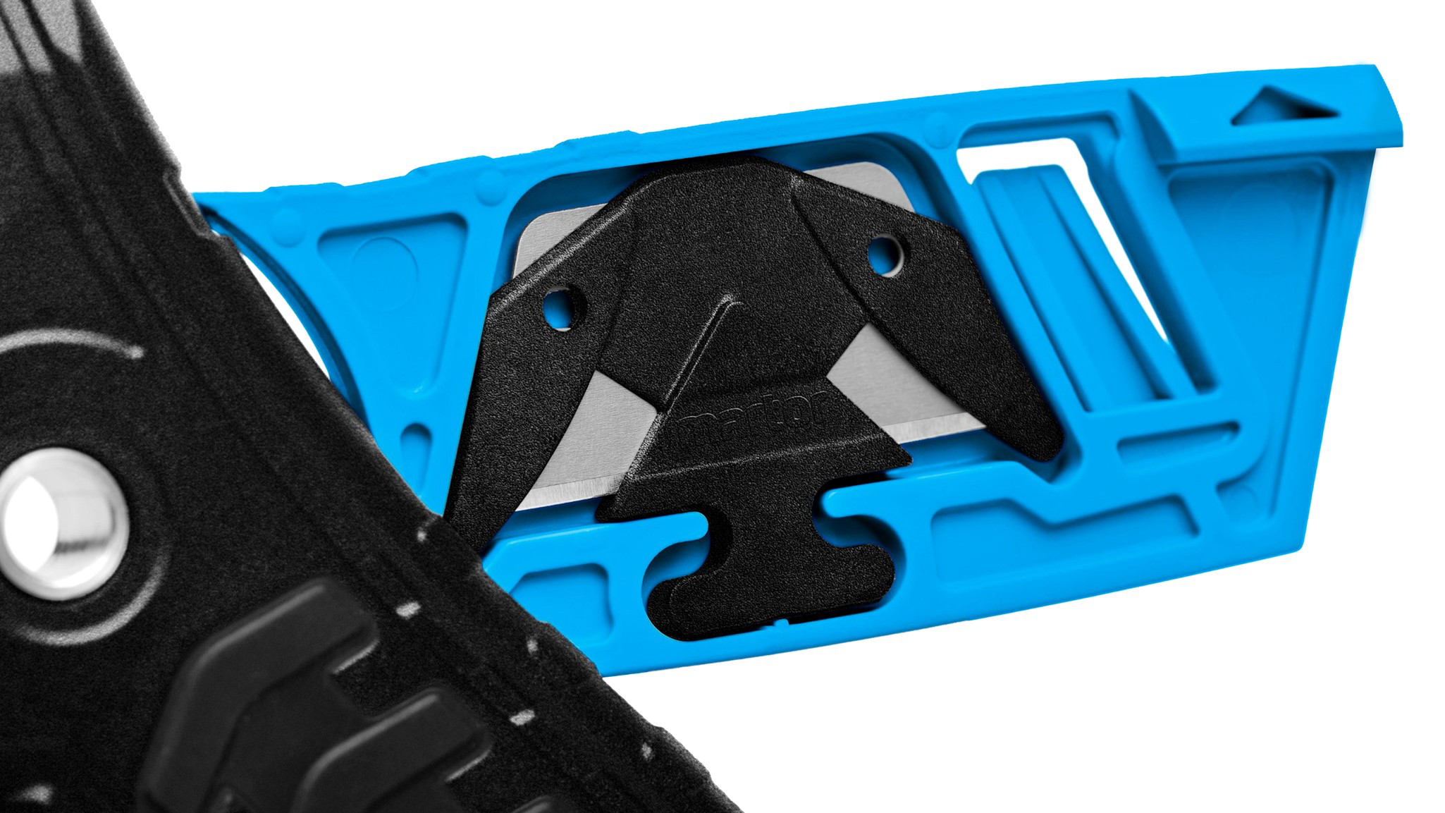 Blade change is easily and safely executed. Look for the arrow and follow its lead. Open the blue inner side of the knife to reveal the spare blade. The mounted blade will simultaneously unlatch.