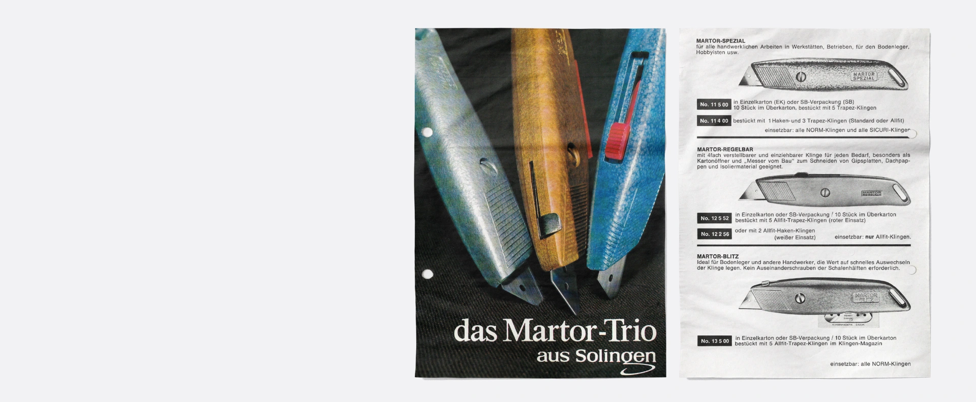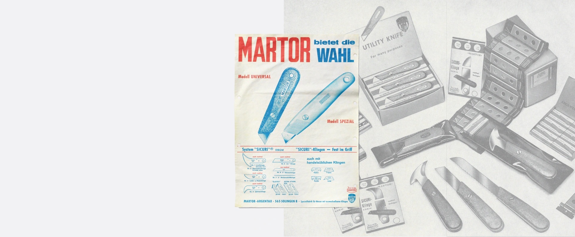 MARTOR se convierte en una «fábrica especializada en cuchillas con hojas intercambiables». Los primeros modelos, UNIVERSAL y SPEZIAL, ya se orientaban, según su nombre, a las diferentes necesidades de los clientes. La gama creció rápidamente, también en lo que respecta a la selección de hojas. Las rasquetas constituían un complemento útil.