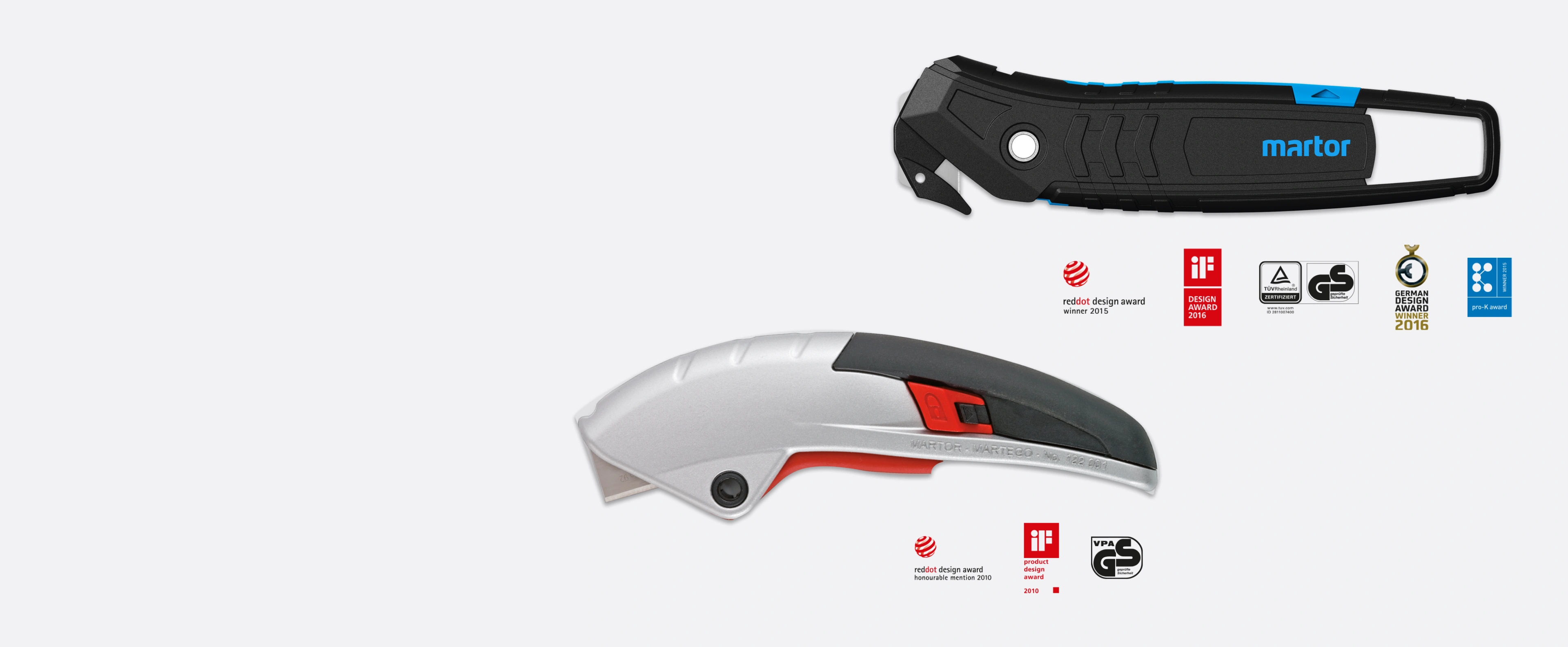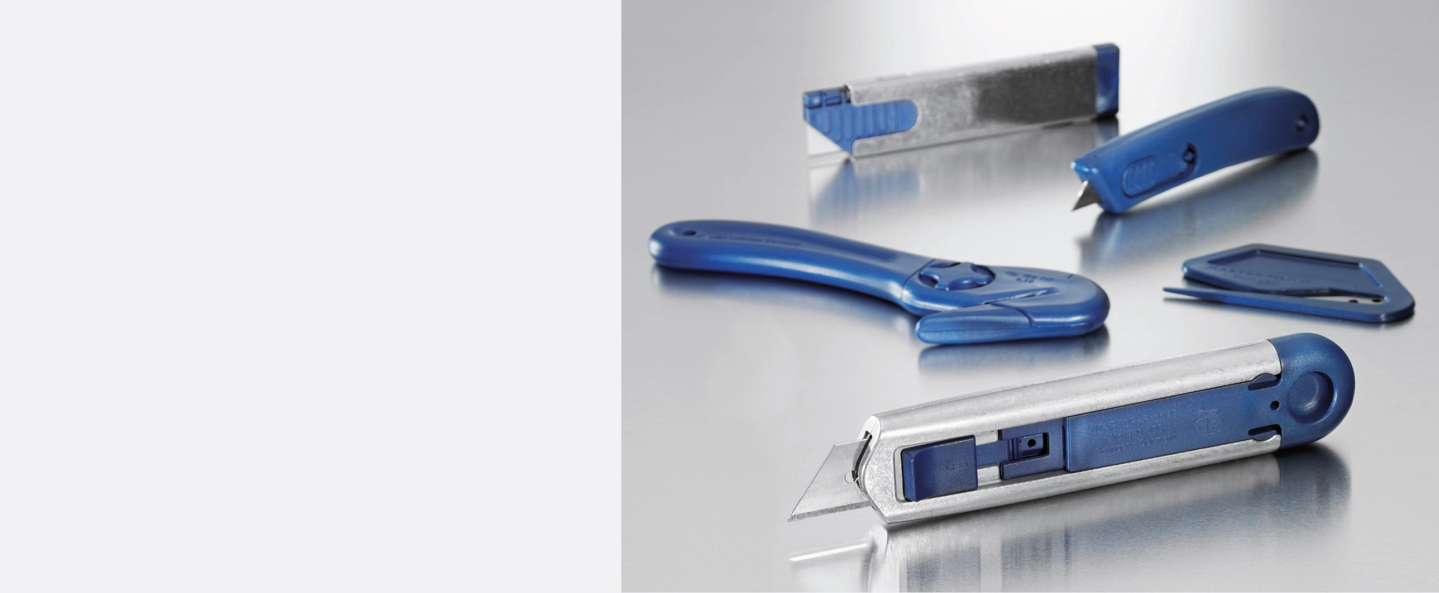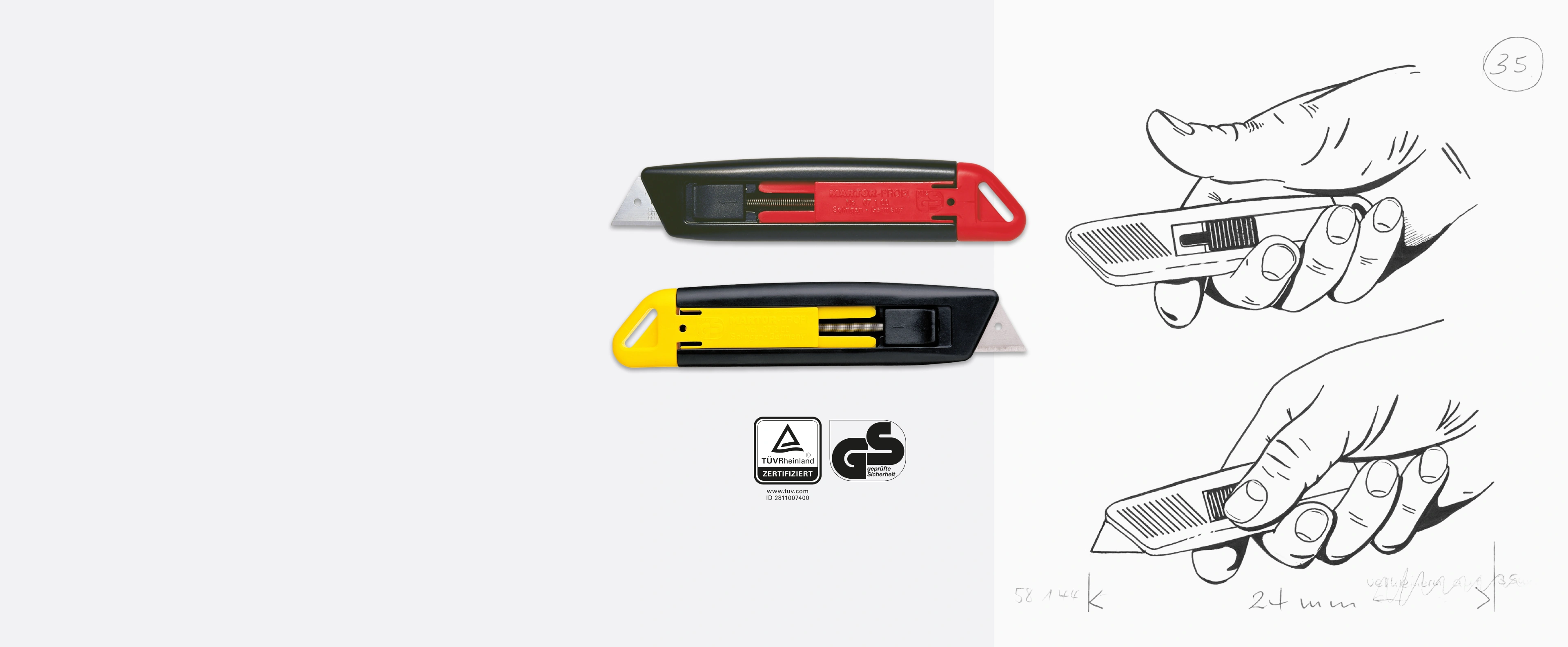 »Cortadores funcionalmente perfectos que protegen al usuario contra lesiones. Una ligera presión con el pulgar hace desaparecer o reaparecer el afilado Martor con la máxima protección.«