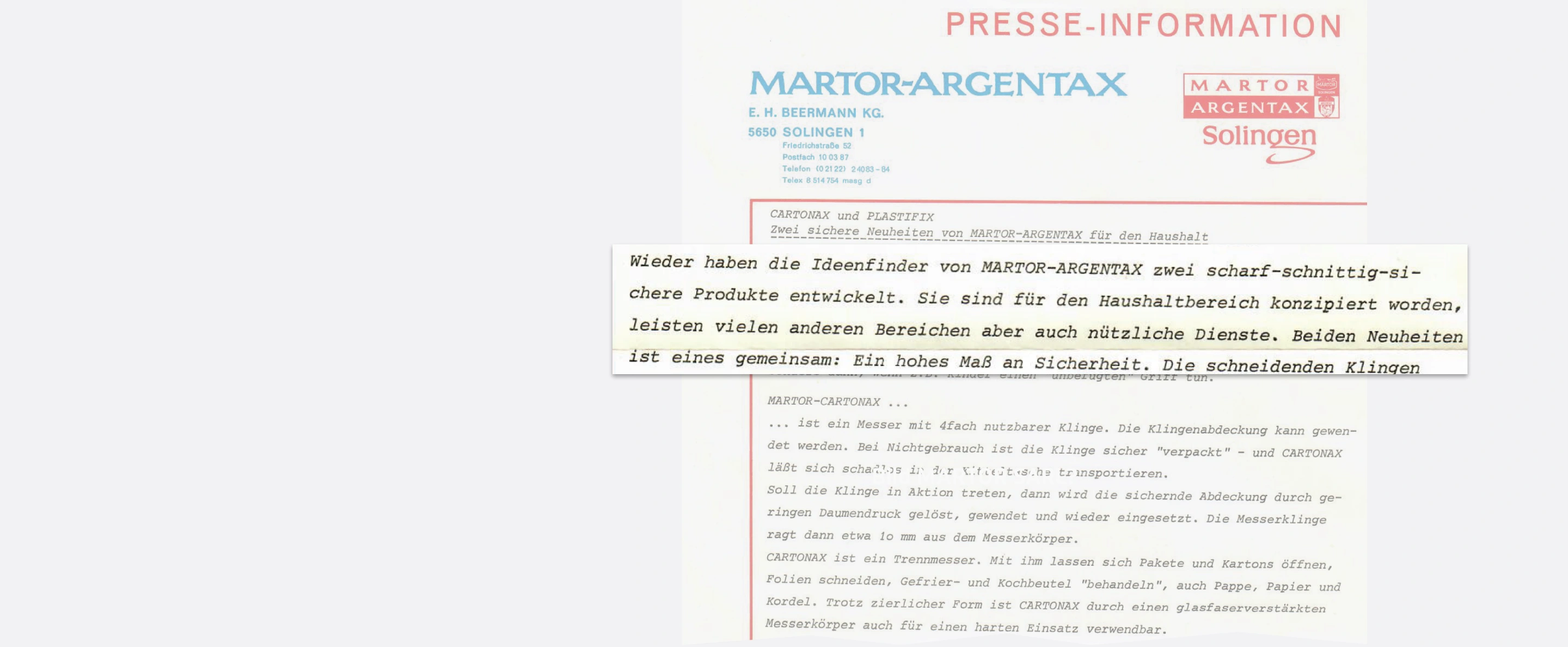 Nuestra identidad se fue consolidando cada vez más en la década de 1970. Nos consideramos «creadores de ideas» que desarrollan «productos afilados y seguros». Esa sigue siendo nuestra pretensión hoy en día: lanzar al mercado cuchillos de seguridadcuchillo de seguridad innovadores que combinen un rendimiento de corte perfecto con una protección laboral óptima.